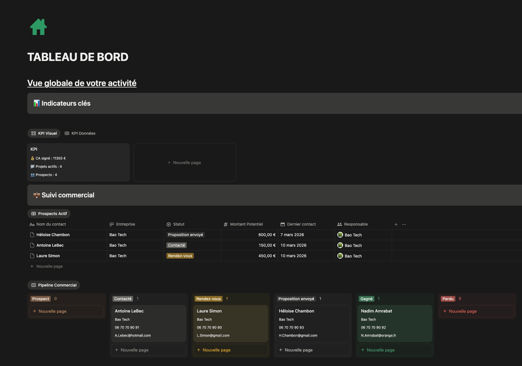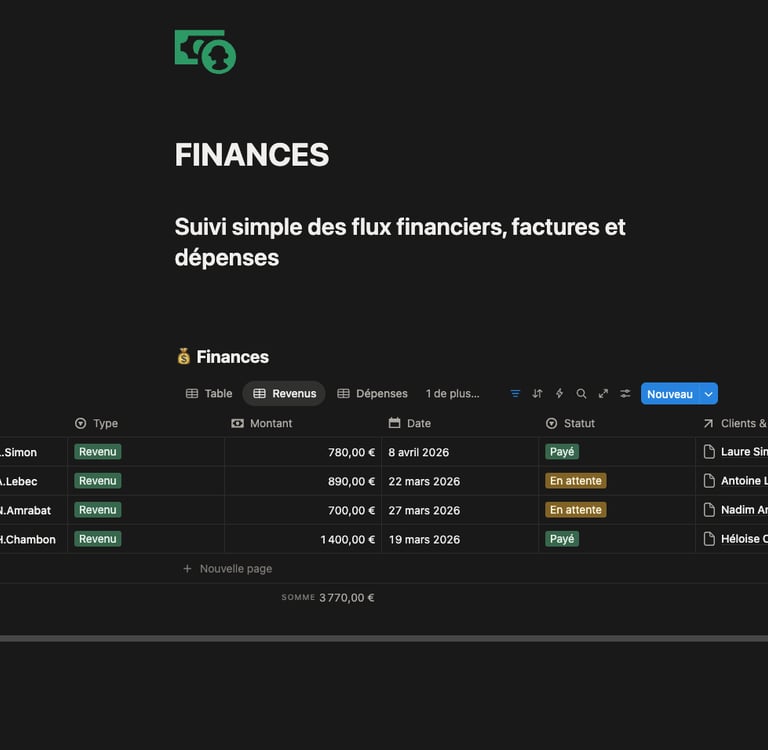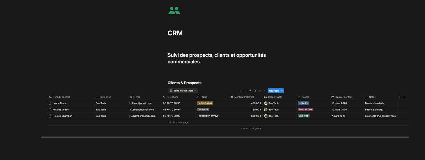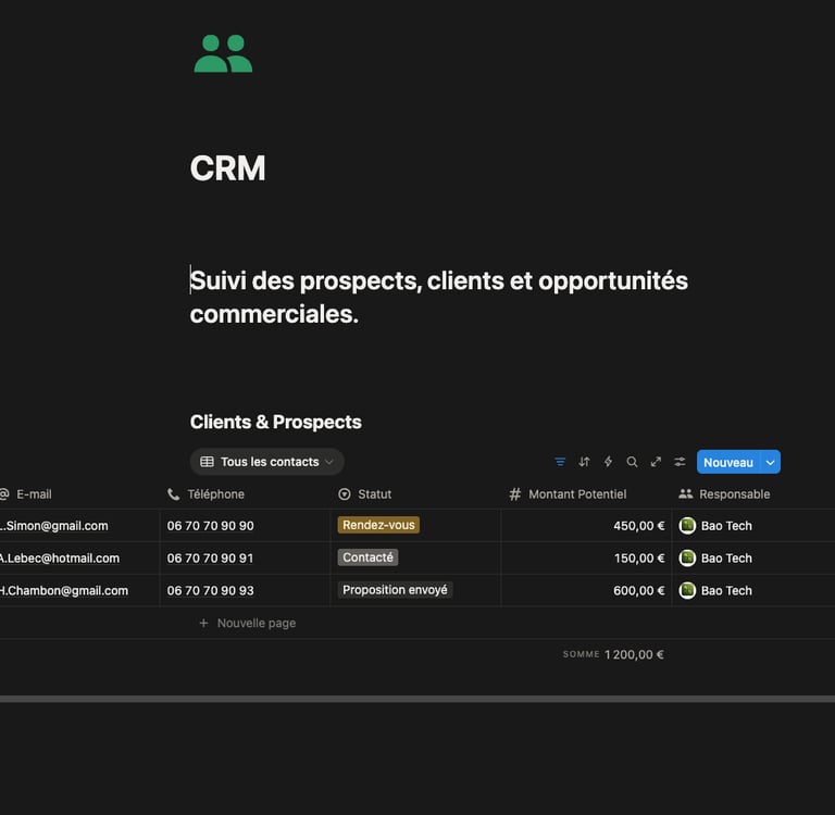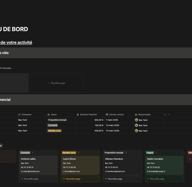 Un espace structuré pour suivre vos prospects, clients et opportunités sans rien oublier. (avec différentes vues, clients archivés, clients urgents, pipeline etc...)