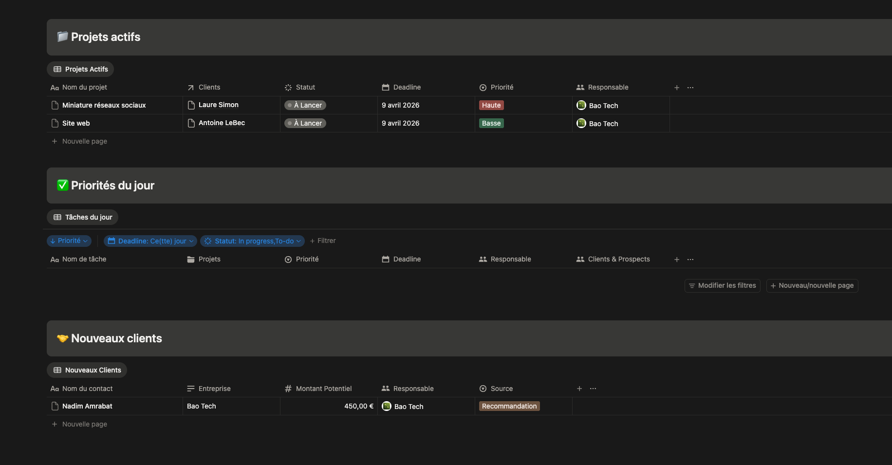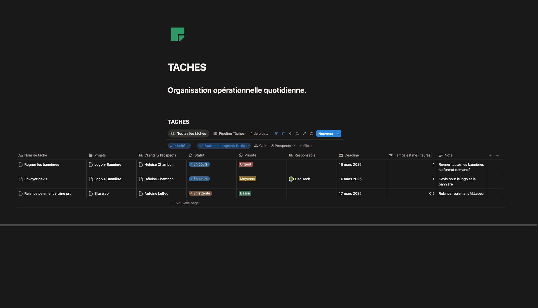 Une organisation claire de votre quotidien pour gérer vos priorités et avancer efficacement.(avec différentes vues, tâches urgentes, tâches par projets, etc...)